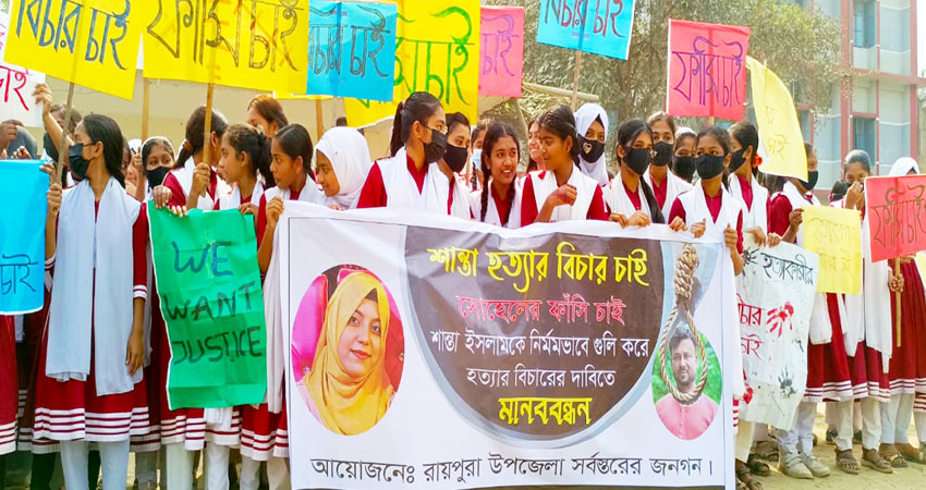 নরসিংদীর রায়পুরায় গোষ্ঠীগত দ্বন্দ্বের জেরে শান্তা ইসলাম (২৪) নামে এক গৃহবধূকে গুলি করে হত্যা মামলার প্রধান আসামি যুবদল নেতা ও তার সহযোগীদের গ্রেপ্তার ও বিচারের দাবিতে মানববন্ধন ও থানা ঘেরাও করেছেন স্বজন এবং এলাকাবাসী।
