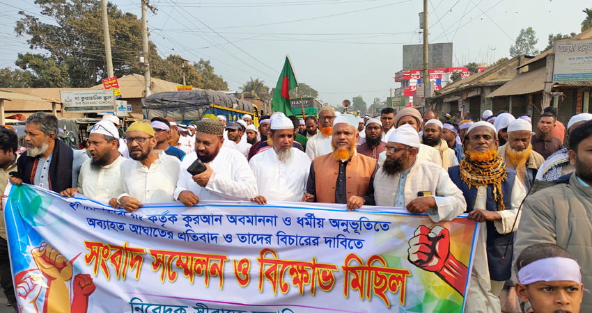 দিনাজপুরের ঘোড়াঘাটে স্থানীয় ভান্ডারী গং কর্তৃক কোরআন অবমাননা ও ধর্মীয় অনুভূতিতে আঘাতের প্রতিবাদে বিক্ষোভ মিছিল ও গণ-সমাবেশ অনুষ্ঠিত হয়েছে।