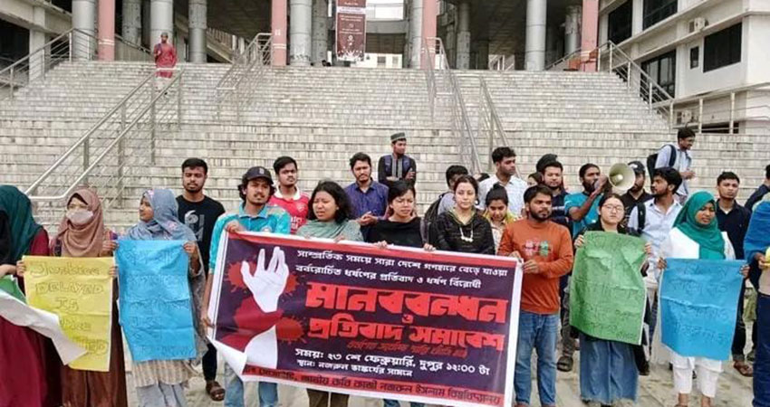 দেশজুড়ে বেড়ে চলা ধর্ষণ, নারী নির্যাতন ও যৌন সহিংসতার বিরুদ্ধে প্রতিবাদ জানাতে মানববন্ধন ও প্রতিবাদ সমাবেশ করেছে ময়মনসিংহের ত্রিশালের জাতীয় কবি কাজী নজরুল ইসলাম বিশ্ববিদ্যালয়ের ডিবেটিং সোসাইটি। রোববার বেলা ১২টার দিকে বিশ্ববিদ্যালয়ের নজরুল ভাস্কর্যের সামনে এ কর্মসূচি অনুষ্ঠিত হয়।