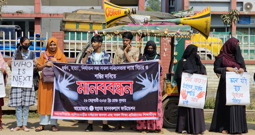 দেশের বিভিন্নস্থানে ধর্ষণ, হত্যা,সহিংসতা, নারী নির্যাতনের প্রতিবাদ এবং নারী-শিশুসহ সবার নিরাপত্তা নিশ্চিতের দাবিতে শেরপুর জেলার নালিতাবাড়ীতে মানববন্ধন অনুষ্ঠিত হয়েছে। উপজেলার স্বেচ্ছাসেবী সংগঠন স্বপ্নময় মানবকল্যাণ ফাউন্ডেশনের আয়োজনে সর্বস্তরের জনগণ ও সকল শিক্ষা প্রতিষ্ঠানের শিক্ষার্থীদের সহোযোগিতায় ওই মানববন্ধন কর্মসুচী পালন করা হয়।