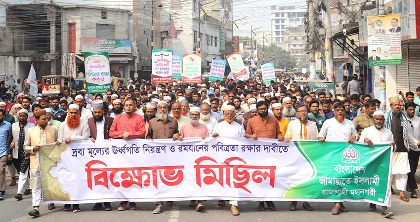 দ্রব্যমূল্যের ঊর্ধ্বগতি রোধ এবং রমজানের পবিত্রতা রক্ষার দাবিতে রাজশাহীতে বিক্ষোভ মিছিল ও সমাবেশ করেছে জামায়াতে ইসলামী।
