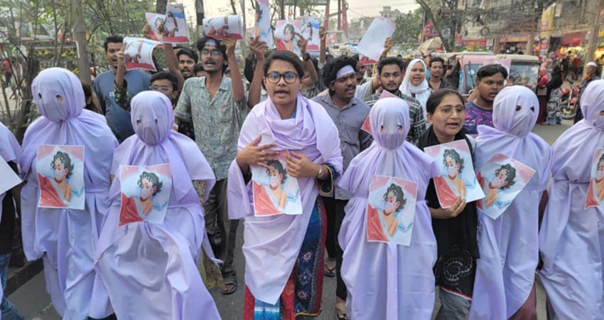 মাগুরায় ধর্ষণের শিকার শিশু আছিয়ার মৃত্যুর ঘটনায় আসামিদের শাস্তির দাবিতে নারায়ণগঞ্জে কাফনের কাপড় পড়ে মিছিল করা হয়েছে।