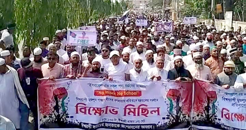 জোহর নামাজের পর শত শত মুসুল্লি খন্ডখন্ড মিছিল নিয়ে শহরের স্টেশন সড়কে কেন্দ্রীয় জামে মসজিদে জড়ো হয়। সেখান থেকে বের হয় বিশাল বিক্ষোভ মিছিল। মিছিলকারীদের হাতে ছিল বাংলাদেশের জাতীয় পতাকা ও ফিলিস্তিনি পতাকা। তারা শ্লোগান দেন ’ফিলিস্তিনে হামলা কেন, জাতিসংঘ জবাব চাই, ইসরায়েলের আস্তানা জ্বালিয়ে দাও, গুড়িয়ে দাও’ ইত্যাদি। মিছিলটি শহরের প্রধান জামে মসজিদ থেকে শুরু হয়ে স্টেশন সড়ক দিয়ে শহরের পোস্ট অফিস মোড় থেকে রেলগেট ট্রাফিক মোড়ে উত্তাল সমাবেশের মধ্য দিয়ে শেষ হয়।