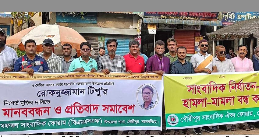 দৈনিক কালের কন্ঠের তালা উপজেলা প্রতিনিধি রোকনুজ্জামান টিপু’র মুক্তি ও তথ্য চাওয়ায় সাংবাদিককে কারাদণ্ড দেওয়ার ঘটনায় তালা ইউএনও’র শাস্তির দাবিতে ময়মনসিংহের গৌরীপুরে মানববন্ধন, বিক্ষোভ মিছিল ও প্রতিবাদ সমাবেশ করেছে বাংলাদেশ মফস্বল সাংবাদিক ফোরাম গৌরীপুর উপজেলা ও গৌরীপুর সাংবাদিক ঐক্য ফোরাম।