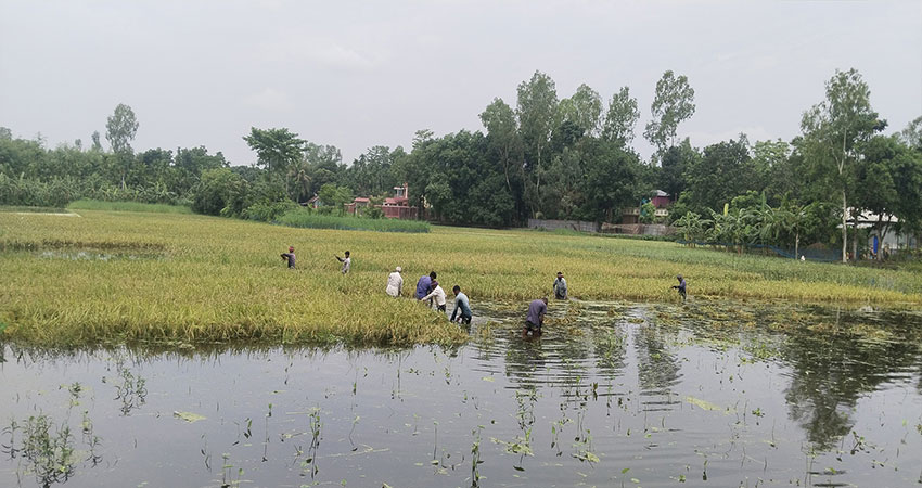 একই এলাকার কৃষক হান্নান বলেন, "২ একর জমির ধান পানির নিচে। কামলা না পেয়ে নিজেই কোমর পানি ডিঙিয়ে ধান কাটছি।"
