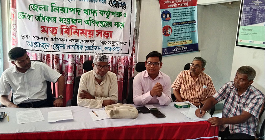 পঞ্চগড়ে নিরাপদ খাদ্য ও ভোক্তা অধিকার নিশ্চিতকরণে এক মতবিনিময় সভা অনুষ্ঠিত হয়েছে। মঙ্গলবার দুপুরে এম আর সরকারি কলেজ সড়কের পরস্পর'র প্রশিক্ষণ কেন্দ্রে এ সভার আয়োজন করে কনজ্যুমারস অ্যাসোসিয়েশন অব বাংলাদেশ (ক্যাব), পঞ্চগড় জেলা শাখা।