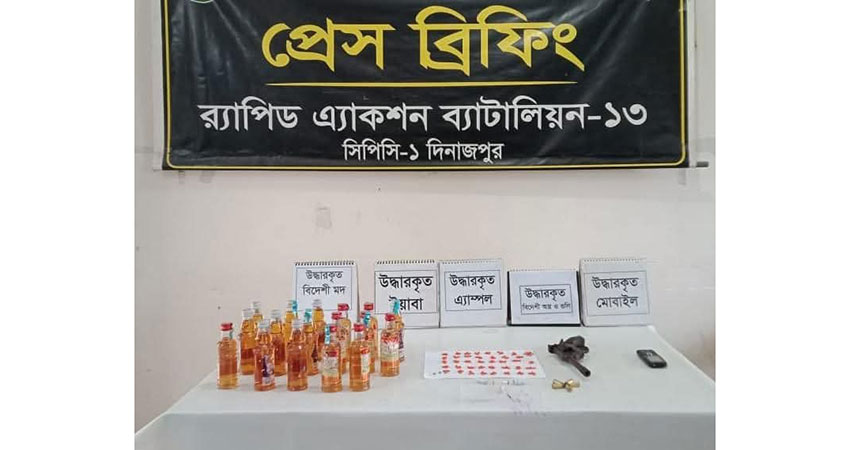 দিনাজপুর সদর উপজেলার কমলপুর ইউনিয়নে অভিযান চালিয়ে বিদেশি পিস্তল, গুলি ও বিদেশি মদসহ বিভিন্ন মাদকদ্রব্য উদ্ধার করেছে র্যাব।