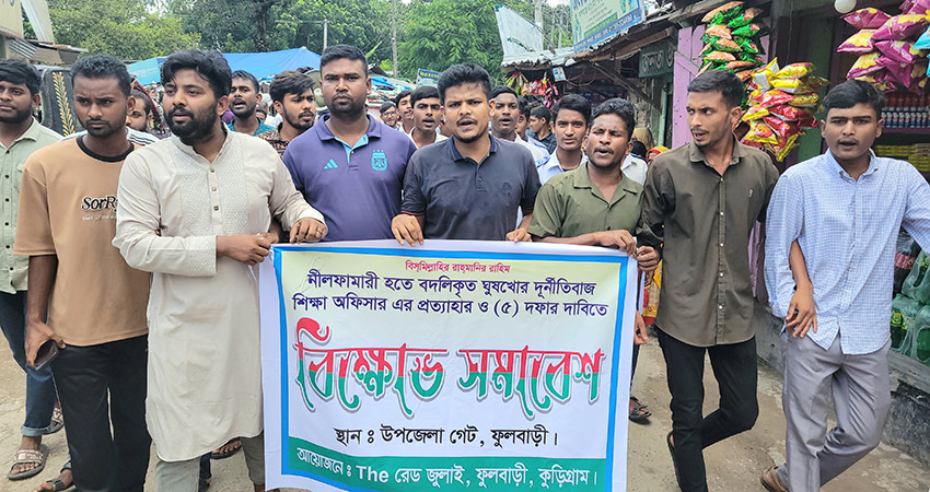 কুড়িগ্রামের ফুলবাড়ীতে উপজেলার ঘুষখোর, দুর্নীতিবাজ প্রাথমিক শিক্ষা অফিসারকে প্রত্যাহারসহ পাঁচ দফা দাবিতে বিক্ষোভ মিছিল ও সমাবেশ অনুষ্ঠিত হয়েছে।