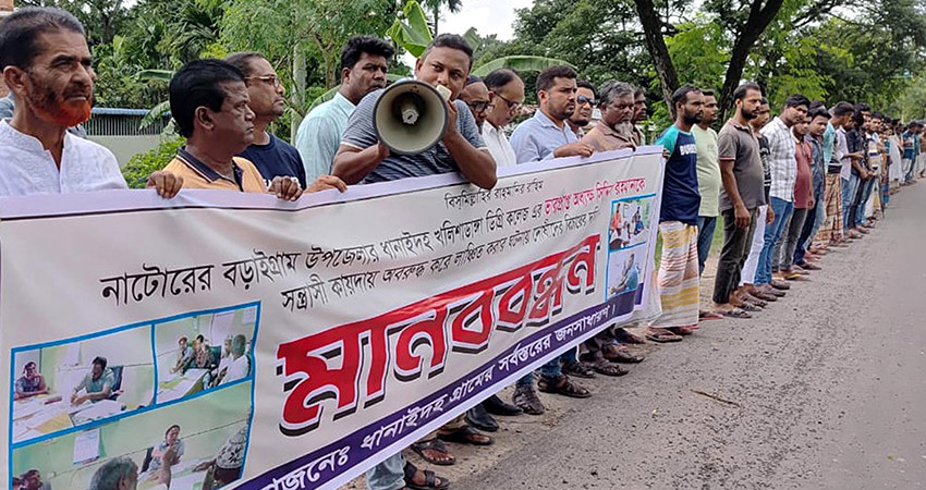 বড়াইগ্রামের খলিশাডাঙ্গা ডিগ্রী কলেজের ভারপ্রাপ্ত অধ্যক্ষ সিদ্দিকুর রহমানকে লাঞ্চিত করার প্রতিবাদে ও দায়ীদের গ্রেফতারের দাবিতে মানববন্ধন করেছে এলাকাবাসী।