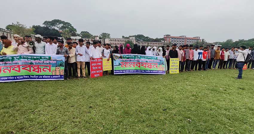 বৃহস্পতিবার (৭ আগস্ট) দুপুর ১২টায় খোয়াজপুর সৈয়দ আবুল হোসেন কলেজ ক্যাম্পাসে এ মানববন্ধনের আয়োজন করা হয়।