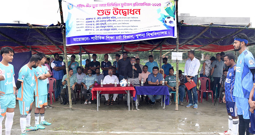 খুলনা বিশ্ববিদ্যালয়ে (খুবি) শুরু হয়েছে শহিদ মীর মুগ্ধ আন্তঃডিসিপ্লিন ফুটবল প্রতিযোগিতা- ২০২৫। বৃহস্পতিবার সকাল ৯টা ৩০ মিনিটে নির্মাণাধীন চতুর্থ একাডেমিক ভবনের সামনের মাঠে প্রধান অতিথি হিসেবে এ প্রতিযোগিতার উদ্বোধন করেন উপাচার্য প্রফেসর ড. মো. রেজাউল করিম।