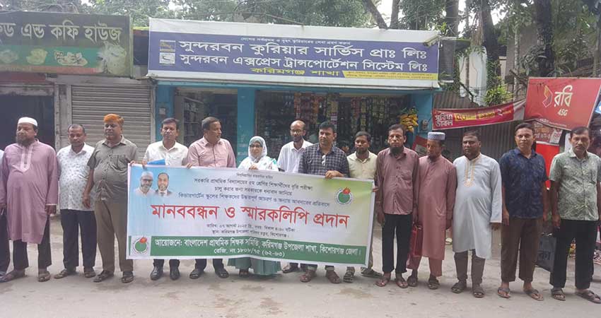 করিমগঞ্জ উপজেলা শিক্ষক সমিতির সভাপতি মো. শামসুল হক ফরহাদের নেতৃত্বে আয়োজিত মানববন্ধনে আরও বক্তব্য রাখেন সাধারণ সম্পাদক মো. হাদিউল ইসলাম, সাংগঠনিক সম্পাদক মো. সাদির মিয়া, নির্বাহী সম্পাদক আনোয়ার হোসেন, যুগ্ম মহিলা সম্পাদক ফাতেমা কামরুন্নাহার শোভা, সহ-অর্থ সম্পাদক শামসুল আলম শামীম ও আনোয়ারুল হক প্রমুখ।