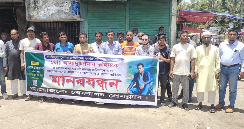 গাজীপুরে দৈনিক প্রতিদিনের কাগজের সাংবাদিক আসাদুজ্জামান তুহিনকে হত্যার প্রতিবাদে বিচার চেয়ে মানববন্ধন করেছে চরফ্যাশন প্রেসক্লাবের সদস্যরা।