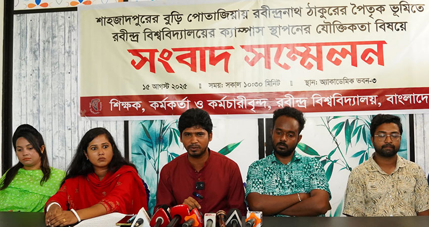 শাহজাদপুরের বুড়ি পোতাজিয়ায় কবিগুরু রবীন্দ্রনাথ ঠাকুরের পৈতৃক ভিটায় রবীন্দ্র বিশ্ববিদ্যালয়ের স্থায়ী ক্যাম্পাস স্থাপন এবং সংশ্লিষ্ট ডিপিপি দ্রুত অনুমোদনের দাবিতে পৃথক তিনটি সংবাদ সম্মেলন করেছেন বিশ্ববিদ্যালয়ের শিক্ষক, কর্মকর্তা-কর্মচারী, শিক্ষার্থী এবং বহলবাড়ি-বুড়ি পোতাজিয়া সচেতন নাগরিক ফোরাম।