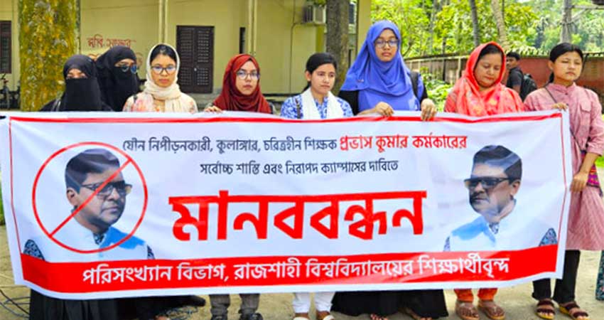 রাজশাহী বিশ্ববিদ্যালয়ের (রাবি) পরিসংখ্যান বিভাগের অধ্যাপক ড. প্রভাস কুমার কর্মকারের বিরুদ্ধে যৌন নিপীড়নের অভিযোগ এনে শিক্ষার্থীরা তার সর্বোচ্চ শাস্তি বহিষ্কার ও নিরাপদ ক্যাম্পাসের দাবি জানিয়েছেন।