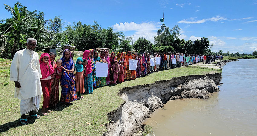 কুড়িগ্রামের ফুলবাড়ীতে ধরলার তীব্র ভাঙ্গন রোধে টেকসই বাঁধ নির্মাণের দাবিতে স্থানীয়রা মানববন্ধন করেছে।