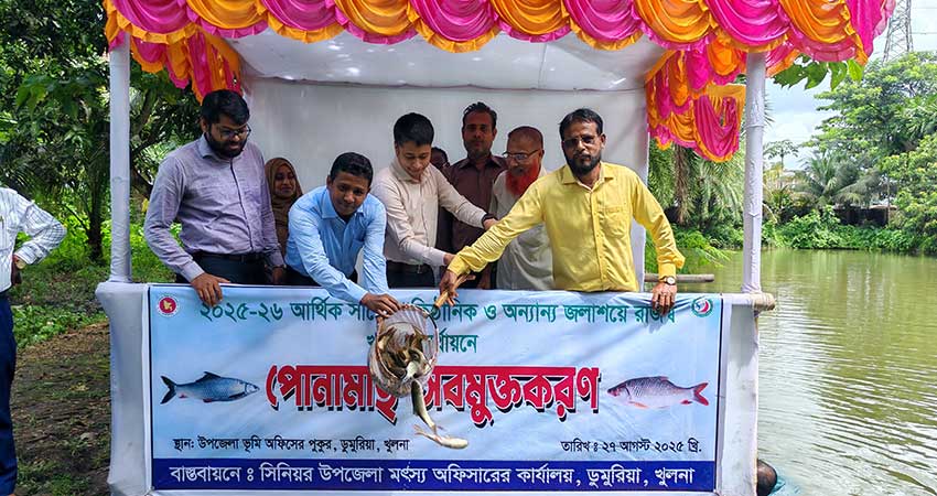 পোনা মাছ অবমুক্তকরণ অনুষ্ঠানের উদ্বোধন করেন জেলা মৎস্য কর্মকর্তা খুলনা মো. বদরুজ্জামান ও সহকারী কমিশনার (ভূমি) অপ্রতিম কুমার চক্রবর্তী।