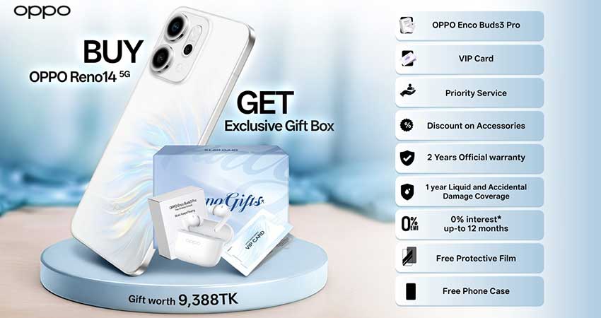 এই অফারের অংশ হিসেবে, প্রতিটি রেনো১৪ ফাইভজির ক্রেতা ৯ হাজার ৩৮৮ টাকা সমমূল্যের সুবিধা পাবেন। এর মধ্যে রয়েছে অনবদ্য সাউন্ডের জন্য অপো এনকো বাডস৩ প্রো, প্রিমিয়াম সুবিধার সাথে এক্সক্লুসিভ ভিআইপি কার্ড এবং ১২ মাস পর্যন্ত ০ শতাংশ ইএমআই সুবিধা।