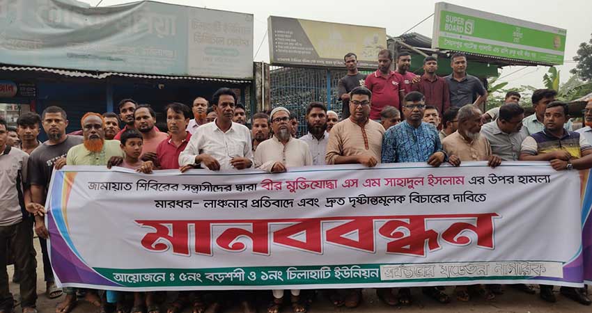 রাজনৈতিক তর্ক-বিতর্কের জেরে এক মুক্তিযোদ্ধাকে লাঞ্ছিত করার ঘটনায় জামায়াত-শিবিরের এক কর্মী ও তার সহযোগীদের বিরুদ্ধে কঠোর শাস্তির দাবিতে মানববন্ধন অনুষ্ঠিত হয়েছে।