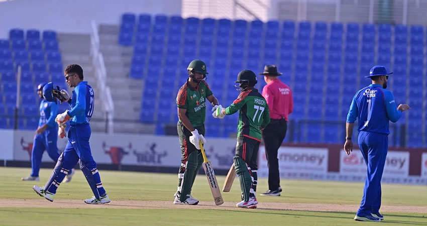 এরপর দলের হাল ধরেন তাওহিদ হৃদয় ও মেহেদী হাসান মিরাজ। মিডল অর্ডারে এই দু’জন গড়েন ১০১ রানের চমৎকার একটি জুটি। হাফ সেঞ্চুরি করেন উভয় ব্যাটারই। হৃদয় করেন ৮৫ বলে ৫৬ রান। তবে, রান নেওয়ার সময় ভুল বোঝাবুঝিতে রানআউট হয়ে ফেরেন তিনি। তখন দলের রান ১৫৪।