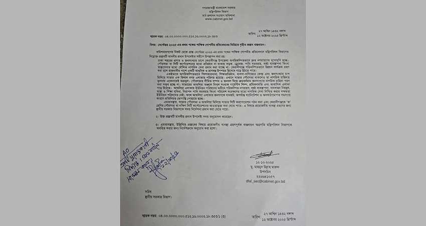 চলতি মাসের ১২ অক্টোবর মন্ত্রিপরিষদ বিভাগের উপসচিব মু. মাহমুদ উল্লাহ মারুফ স্বাক্ষরিত এক পত্রে বিষয়টি জানা গেছে।