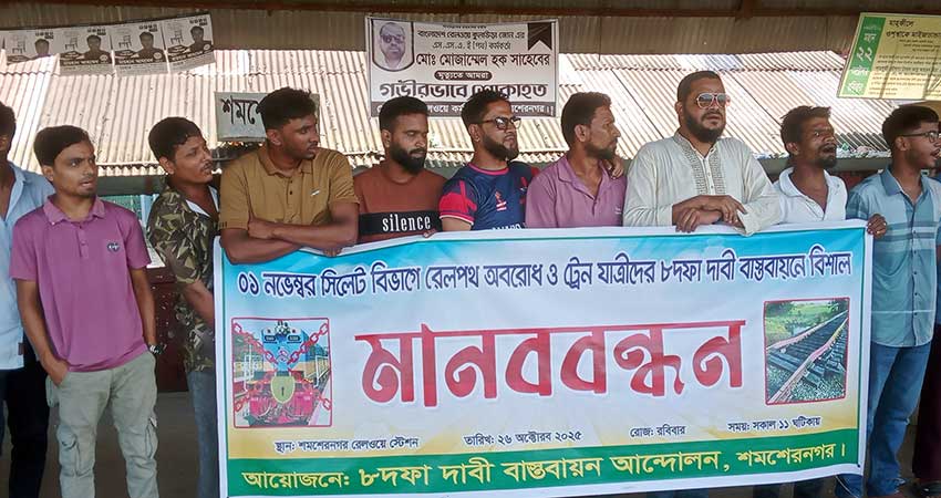 মানববন্ধনে বক্তারা বলেন, সিলেট-ঢাকা ও সিলেট-কক্সবাজার রেলপথে দু’টি স্পেশাল ট্রেন চালু করা, আখাউড়া-সিলেট রেলপথ সংস্কার ও ডুয়েলগেজ ডাবল লাইনে উন্নীতকরন, এই সেকশনে ট্রেনের টিকেট কালোবাজারী রোধ, সিলেটের স্টেশন সমুহে আসন সংখ্যা বৃদ্ধি করা, যাত্রীদের চাহিদা অনুপাতে প্রতিটি ট্রেনে অতিরিক্ত বগি সংযোজন করাসহ বৃহত্তর সিলেটবাসীর প্রাণের দাবি ৮ দফা দ্রুত বাস্তবায়নের দাবিতে আগামী ১লা নভেম্বর সিলেট টু শায়েস্তাগঞ্জ পর্যন্ত রেলপথ অবরোধ করা হবে।