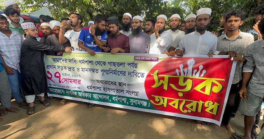 ‘নাগরিক অধিকার আন্দোলন, ধর্মপাশা, সুনামগঞ্জ’-এর আয়োজনে সকাল ১১টা থেকে দুপুর ১টা পর্যন্ত এ কর্মসূচি চলে। এতে হাজারো সাধারণ মানুষ, ব্যবসায়ী, শিক্ষার্থী ও পরিবহন শ্রমিক অংশ নেন। “আমাদের দাবি একটাই—ধর্মপাশায় রাস্তা চাই”—এই স্লোগানে মুখরিত হয়ে ওঠে পুরো এলাকা।